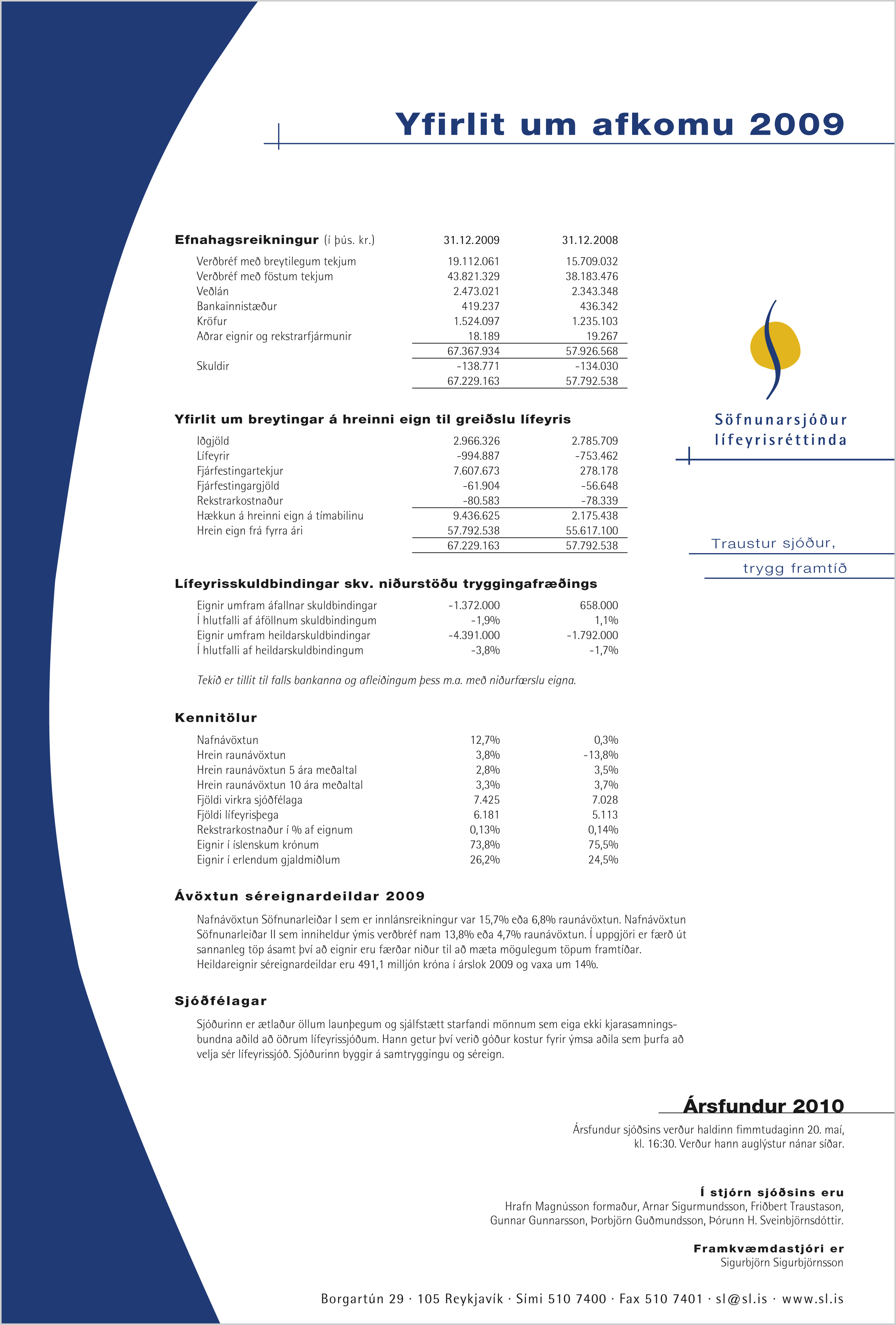 Nú liggur fyrir uppgjör Söfnunarsjóðs lífeyrisréttinda miðað við 31.12.2009. Eignir eru færðar niður til að mæta mögulegum töpum framtíðar. Hrein eign til greiðslu lífeyris er í árslok 67,2 milljarðar króna og óx um 9,4 milljarða króna eða um 16,3% frá fyrra ári. Iðgjöld vaxa um 6,3% og námu 3,0 milljörðum króna. Lífeyrisgreiðslur jukust um 35,8% og námu 990 milljónum króna. Mest jukust greiðslur vegna ellilífeyris eða um 34,9% og námu 682 milljónum króna. Hlutfall ellilífeyris fer áfram vaxandi sem hlutfall af heildarlífeyrisgreiðslum sjóðsins. Afkoma sjóðsins var þannig að hrein nafnávöxtun nam 12,7% og hrein raunávöxtun 3,8%. Meðaltal hreinnar raunávöxtunar síðastliðin 5 ár er 2,8% og síðastliðin 10 ár 3,3%.